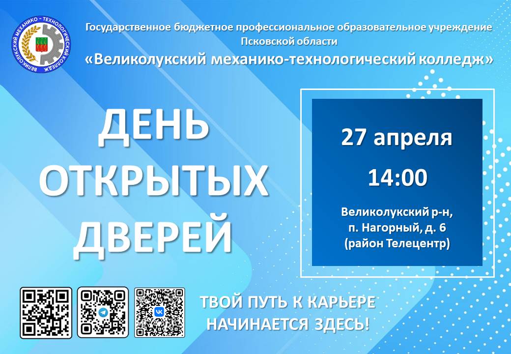 Государственное бюджетное профессиональное образовательное учреждение Псковской области "Великолукский механико-технологический колледж" проводит День открытых дверей 27 апреля 2023 года в 14-00 по адресу: Великолукский район, п.Нагорный, д.6.